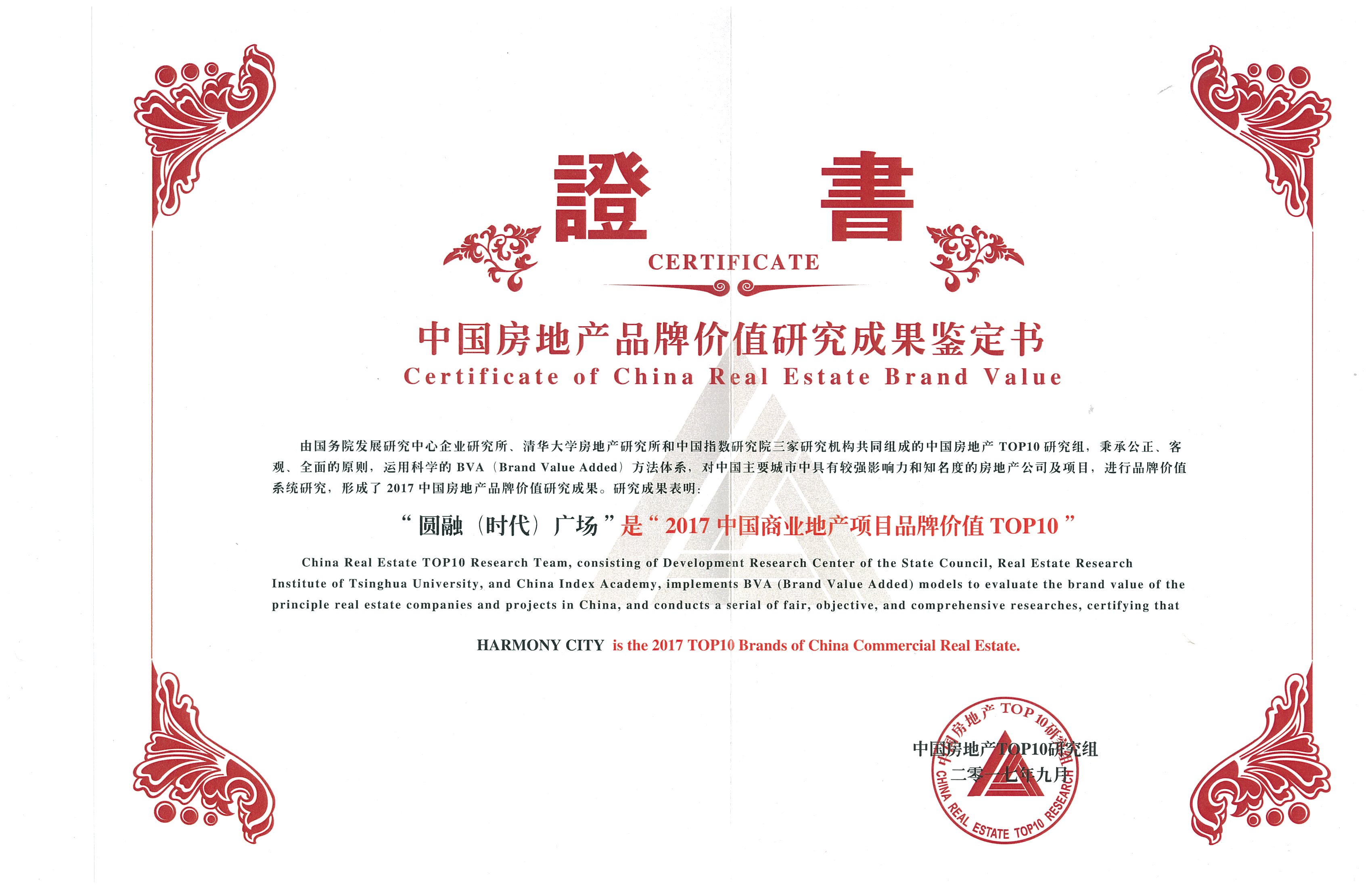 圓融時(shí)代廣場(chǎng)獲評“2017中國商業(yè)地產(chǎn)項目品牌價(jià)值TOP10”