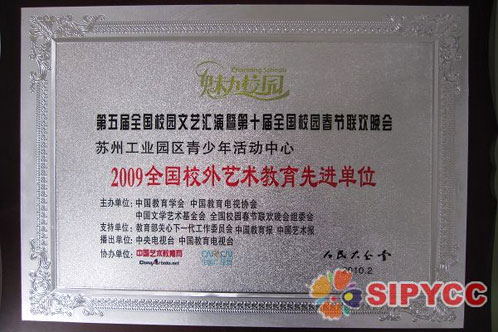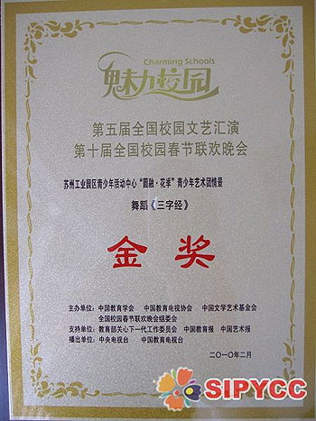 由中國教育學(xué)會(huì )、中國教育電視協(xié)會(huì )、中國文學(xué)藝術(shù)基金會(huì )、全國校園春節聯(lián)歡晚會(huì )組委會(huì )共同主辦的“魅力校園”第十屆全國校園春節聯(lián)歡晚會(huì )日前在北京舉行。從全國30多個(gè)省市300多個(gè)送審節目中初評出來(lái)的一、二等獎精選優(yōu)秀節目,參加了赴京匯演?!皥A融·花季”藝術(shù)團藝術(shù)總監高菊珍老師創(chuàng )編的少兒情景舞蹈《三字經(jīng)》在匯演活動(dòng)中榮獲金獎,園區青少年活動(dòng)中心同時(shí)獲得“2009年度全國校外藝術(shù)教育先進(jìn)單位”稱(chēng)號。這也是園區青少年活動(dòng)中心“圓融·花季”藝術(shù)團成立六個(gè)月來(lái)首獲全國大獎。