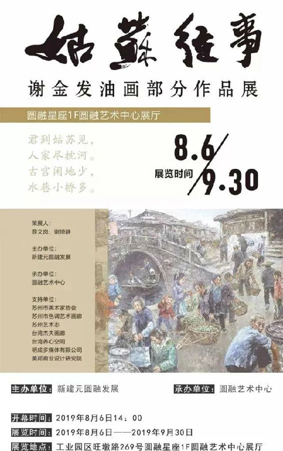 在中華人民共和國成立70周年,蘇州工業(yè)園區開(kāi)發(fā)建設25周年之際,8月6日由新建元圓融發(fā)展主辦、圓融藝術(shù)中心承辦的:“姑蘇往事”謝金發(fā)油畫(huà)作品展,在圓融藝術(shù)中心展廳隆重舉辦。謝金發(fā)老師帶著(zhù)他和他的作品,向蘇州人民展示雋刻在時(shí)光里的印記,以此致謝蘇城以及對家鄉深深的情懷。