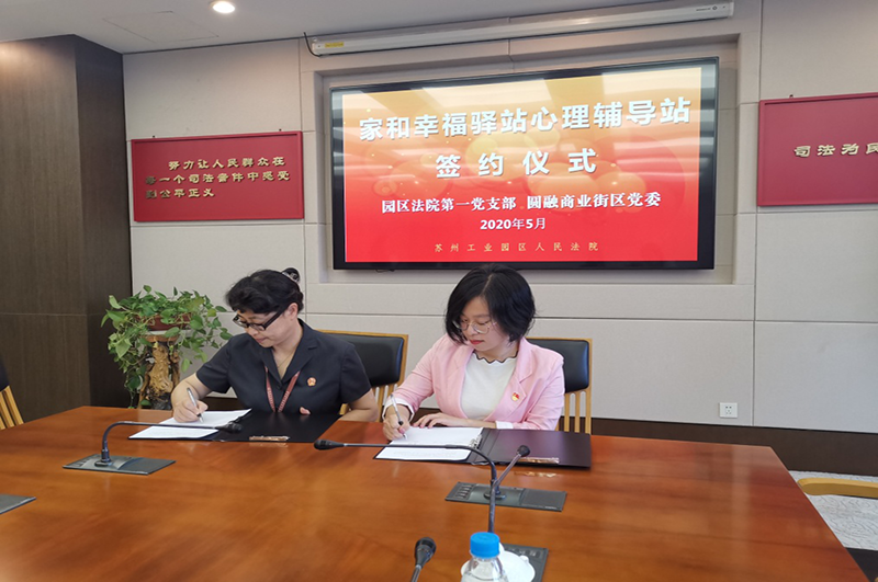 5月26日上午,蘇州工業(yè)園區人民法院與新建元圓融商業(yè)街區黨委舉行共建簽約儀式,標志著(zhù)雙方黨建合作項目“‘家和’心理輔導站”正式落地新建元圓融商業(yè)街區黨群服務(wù)中心。