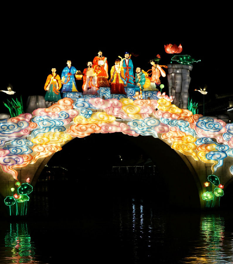 已經(jīng)76歲高齡的蘇州燈彩項目國家級非物質(zhì)文化遺產(chǎn)代表性傳承人—汪筱文老師帶著(zhù)他平均年齡超50歲的制作團隊,經(jīng)過(guò)3個(gè)多月的設計制作,在斜塘河畔再次呈上了一個(gè)個(gè)蘇州燈彩的精心之作。長(cháng)24米的主景燈“八仙過(guò)?!睙艚M取材于耳熟能詳深受喜愛(ài)的八仙故事,八位神仙大咖造型各異,腳踩祥云乘風(fēng)破浪,動(dòng)感十足栩栩如生。水中的倒影更是色彩斑斕,相映成趣,遠遠望去十分震撼。