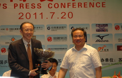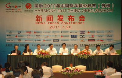 圓融2011年中國乒乓球公開(kāi)賽(蘇州)新聞發(fā)布會(huì )于7月20日下午在蘇州舉行,國家體育總局乒乓球羽毛球運動(dòng)管理中心副主任劉于斌,江蘇省體育局副局長(cháng)周旭,蘇州市副市長(cháng)王鴻聲,蘇州市市委常委、宣傳部部長(cháng)徐國強等領(lǐng)導出席發(fā)布會(huì )。圓融集團副總裁沙勇作為冠名贊助商代表與賽事組委會(huì )簽約,并接受了蘇州市副市長(cháng)王鴻聲頒發(fā)的紀念杯。