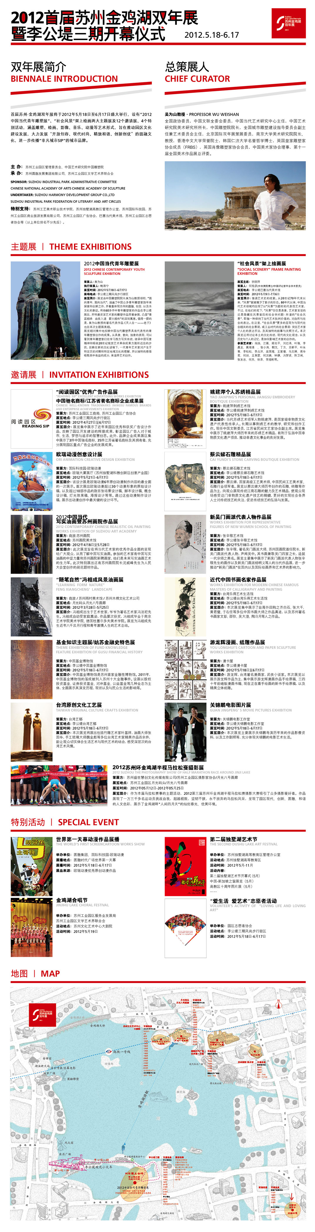 據介紹,首屆“蘇州 金雞湖雙年展”的主題展有二,一個(gè)是“2012中國當代青年雕塑展”,由中國雕塑院策展;另一個(gè)是“社會(huì )風(fēng)景”架上繪畫(huà),由巴塞當代美術(shù)館策展。邀請展有十二項,包括:“閱讀園區”現代廣告設計展、歐瑞動(dòng)漫創(chuàng )意設計展、2012中國當代寫(xiě)實(shí)油畫(huà)暨蘇州畫(huà)院作品展、“隨筆自然”馮相成風(fēng)景油畫(huà)展、姚建萍個(gè)人蘇繡精品展、國際工藝美術(shù)大師蔡云娣石雕精品展、新吳門(mén)畫(huà)派名家作品展、基金產(chǎn)業(yè)的崛起――基金發(fā)展專(zhuān)題展、漫畫(huà)大師游龍輝漫畫(huà)和紙雕作品展示、臺灣文化工藝與現代藝術(shù)聯(lián)展、關(guān)錦鵬藝術(shù)工作系列展、近代中國書(shū)畫(huà)名家作品展等。主題展和邀請展之外,首屆“蘇州 金雞湖雙年展”還策劃了四場(chǎng)特別活動(dòng),包括圓融天幕動(dòng)漫作品展播、金雞湖合唱節、獨墅湖科教創(chuàng )新區藝術(shù)節系列活動(dòng)、“愛(ài)生活、愛(ài)藝術(shù)”志愿者活動(dòng)。