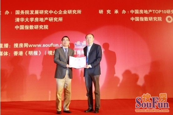 中國指數研究院院長(cháng)莫天全(左)為圓融集團副總裁沙勇(右)頒獎