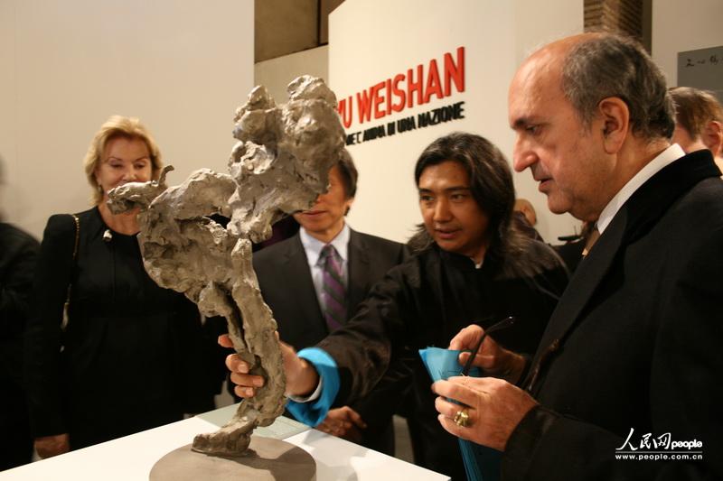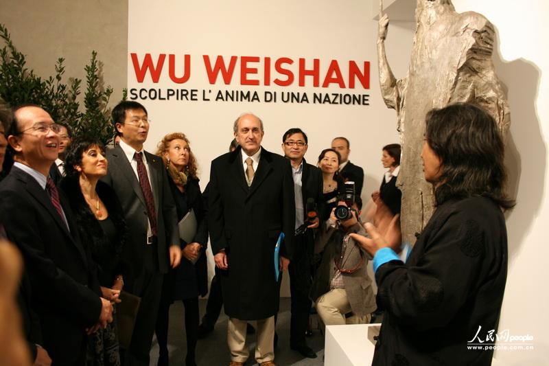 吳為山為出席開(kāi)幕式的貴賓介紹其作品,左一為中國駐意大利大使丁偉。