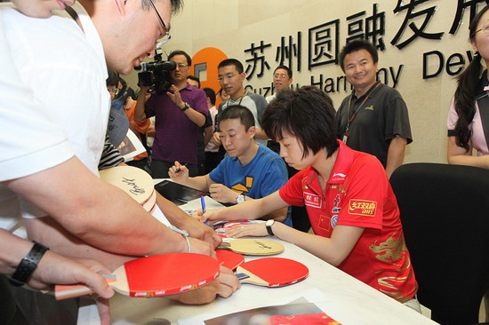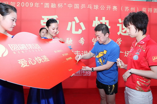 昨日,為慶?!皥A融杯”中國乒乓球公開(kāi)賽圓滿(mǎn)閉幕,因故未能參加此次中國乒乓球公開(kāi)賽的奧運冠軍馬琳、張怡寧,受本次賽事冠名單位圓融集團邀請,下午到訪(fǎng)圓融集團與球迷及國球愛(ài)好者親密互動(dòng)。隨后,又來(lái)到圓融時(shí)代廣場(chǎng),張怡寧、馬琳親筆簽名啟動(dòng)愛(ài)心郵包郵寄儀式,郵包內100付乒乓球拍于6月8日正式啟程,捐贈給位于陜西吳堡縣的圓融小學(xué)的師生們。
